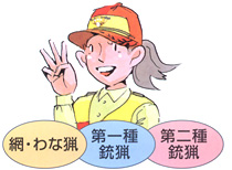 試験は、●網猟免許(網を用いる者)、●わな猟免許(わなを用いる者)、●第一種銃猟免許(散弾銃、ライフル銃、空気銃を用いる者)、●第二種銃猟免許(空気銃を用いる者)の4種に分かれ、それぞれ適性試験、技能試験、知識試験が行われます。適性試験は視力、聴力、運動能力について。技能試験では、網猟・わな猟免許は法定猟具かどうかの判別、猟具の架設、狩猟鳥獣の瞬間的判別など。第一種・第二種銃猟免許では各銃器の操作、動作など、距離の目測、狩猟鳥獣の瞬間的判別などとなっています。知識試験は4種すべて、法令、猟具、鳥獣に関する知識が試されるものです。 |